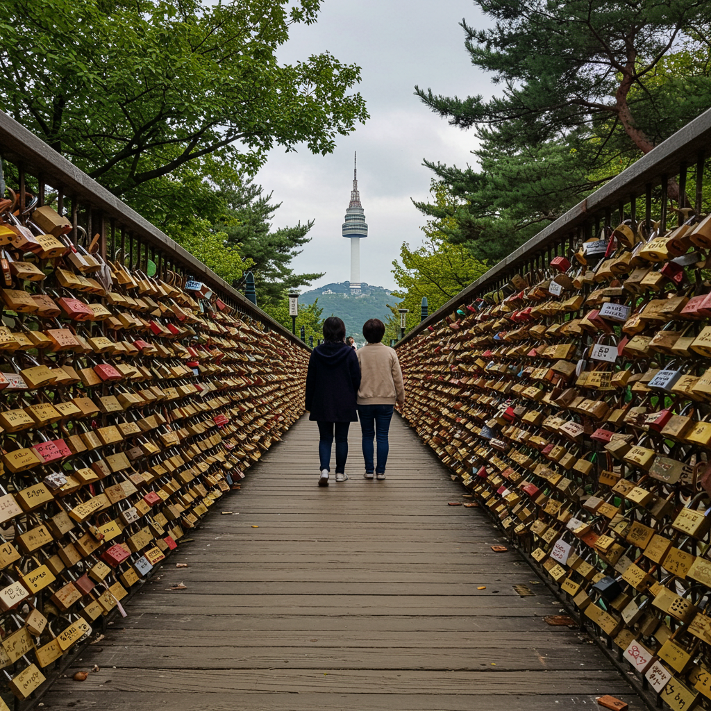 The ultimate symbol of K-Drama romance: N Seoul Tower (Namsan Tower)! The railing filled with 'Love Locks' is a famous spot where countless couples promise eternal love. (Featured Dramas: My Love from the Star, Boys Over Flowers, Legend of the Blue Sea)