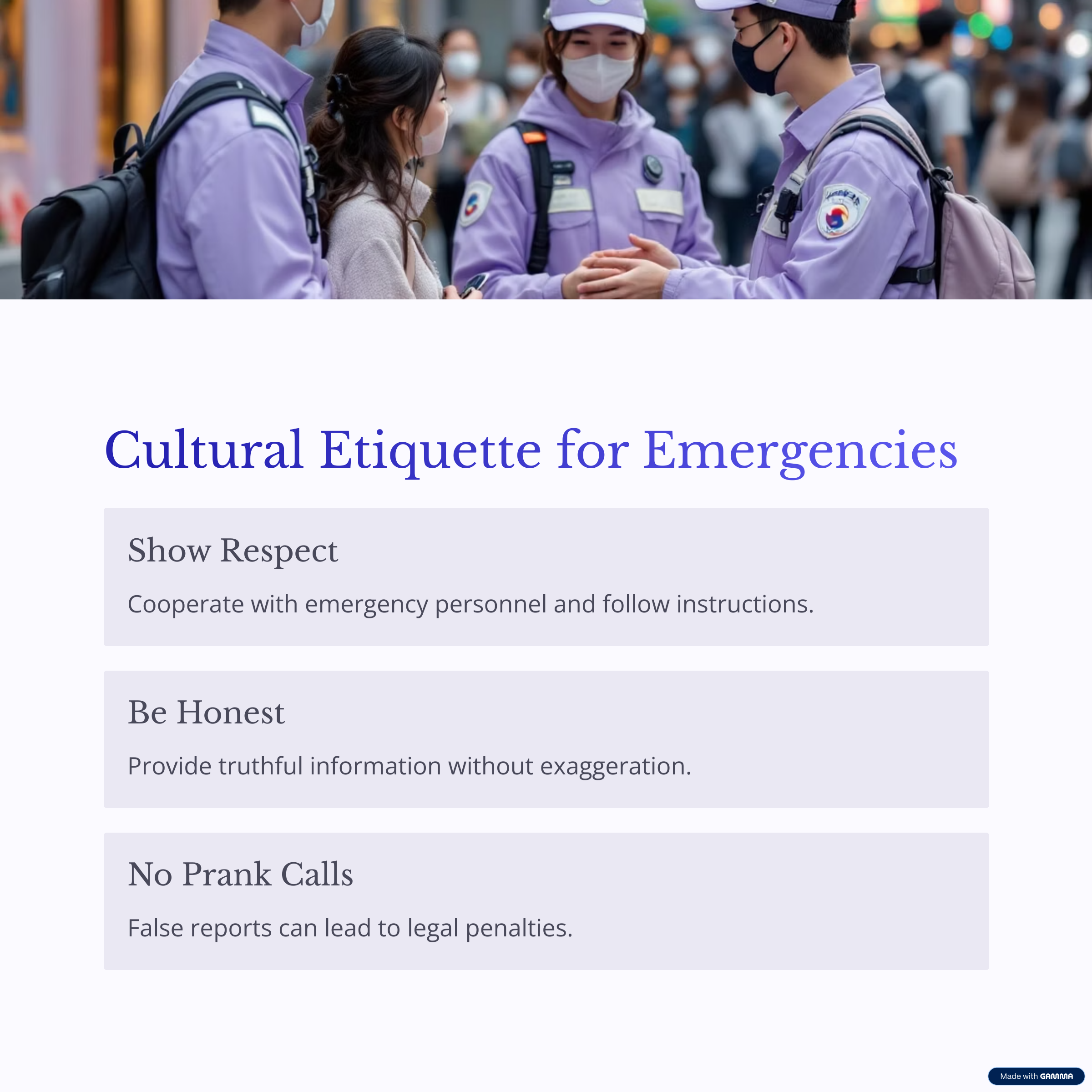 - Respect and Cooperation: Emergency service personnel are there to help you. It's important to cooperate and show respect by following their instructions.